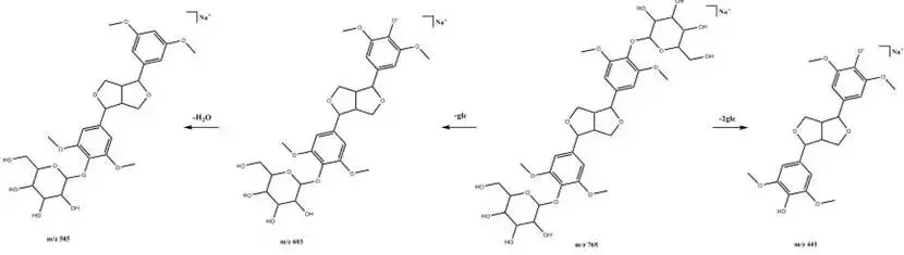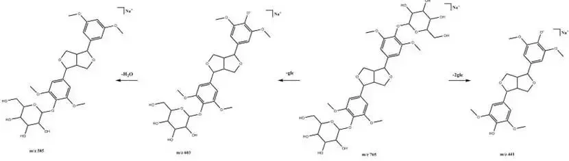 u刺五加苷 E(化合物 50):在正离子模式下形成 m/z 760 [M+NH₄]⁺ 或 m/z 765 [M+Na]⁺ 加合离子,其裂解特征是连续丢失糖基,依次生成 m/z 603 [M+Na-Glc]⁺ 和 m/z 441 [M+Na-2Glc]⁺;此外,m/z 603 碎片还可进一步脱水生成 m/z 585 [[中药分析]]。