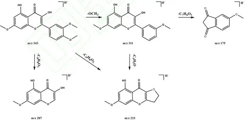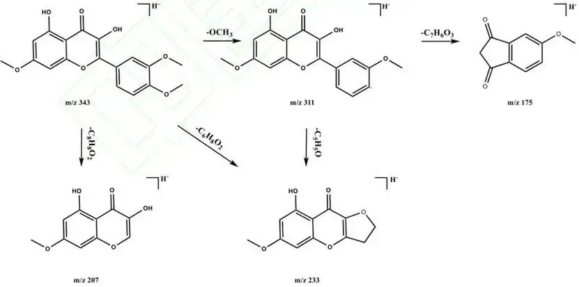 u3',4',7-三甲氧基槲皮素(化合物 81):准分子离子峰 m/z 343 [M-H]⁻。主要裂解路径包括:丢失甲氧基生成 m/z 311 [M-H-OCH₃]⁻;直接脱去 B 环生成 m/z 207 [M-H-C₈H₈O₂]⁻;m/z 311 进一步断裂 B 环生成 m/z 233;或通过中央 C 环断裂重排生成 m/z 175 [[中药分析]]。