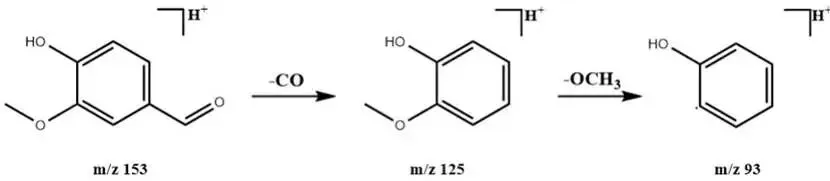 u香兰素(化合物 35):m/z 153 [M+H]⁺ 首先发生醛基 α-断裂,丢失 CO 生成 m/z 125 [M+H-CO]⁺,随后继续丢失甲氧基生成 m/z 93 [M+H-CO-OCH₃]⁺ [[中药分析]]。