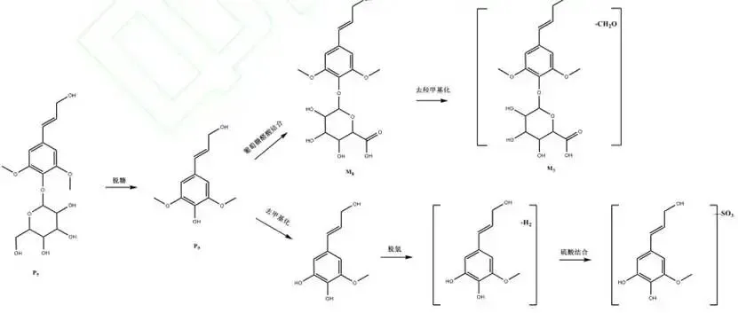 紫丁香苷在体内经历复杂的代谢转化:首先脱糖生成苷元芥子醇;芥子醇可进一步葡萄糖醛酸化生成 M8,或去羟甲基化生成 M3;紫丁香苷脱糖后也可经去甲基化、脱氢后硫酸结合生成 M15 [[中药分析]]。