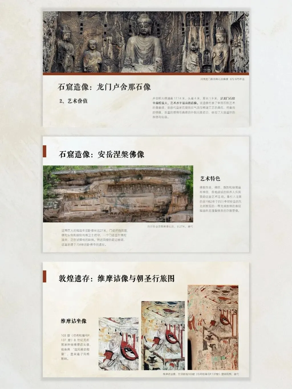 唐代佛教艺术摆脱了早期的拘谨,走向圆润大气,是宗教美学与世俗审美的完美结合。从龙门石窟卢舍那大佛的庄严慈悲,到天龙山石窟的圆润造像,再到敦煌壁画的绚丽绚烂,每一件作品都藏着唐代的精神气度。笔记里梳理了代表性造像、壁画的核心特征、尺寸细节与时代背景,搭配高清作品细节,直观感受唐代佛造像的美学突破。