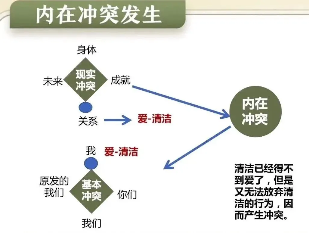 :现实冲突唤醒基本冲突后,我们会发现自己的片面性,但并没有找到新的模式或没有信心使用新模式,这时的冲突,即内在冲突。