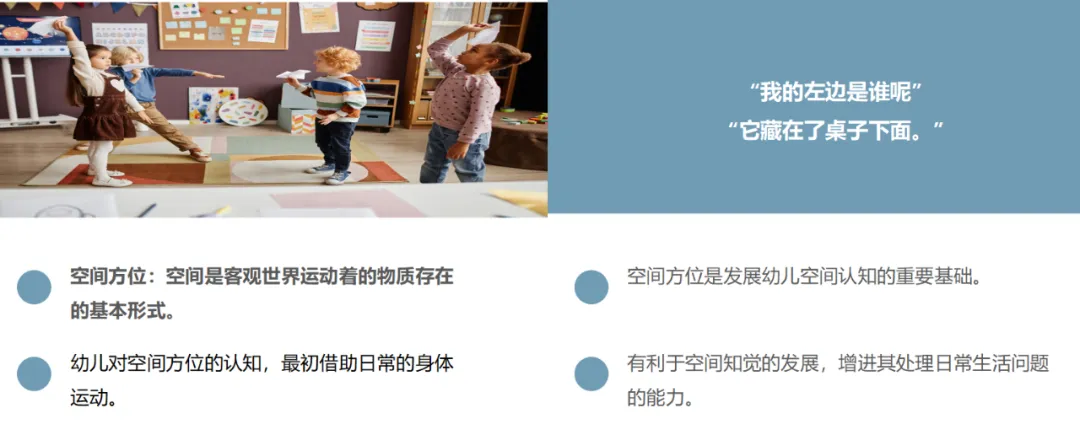 空间位置与方向是发展幼儿空间认知的重要基础,幼儿对空间方位的认知最初通常是借助于日常的身体运动开始的,以自身或周围物体为参照物,随着在空间里移动自己的身体,他们感知了位置、方向、距离的关系,并学习应用相应的空间词。