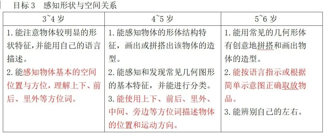 核心经验一:空间方位可以帮助我们准确、详细地表明方向、路线和位置等。空间方位的辨别,是指人对客观物体在空间中所处位置关系的判断。空间位置关系具有三个基本特性:相对性:空间坐标系的三对方向,是相对的概念。上是对下而言,左是对右而言,空间位置是相对的,主体和客体的位置关系是相对的。如:主体是我,客体是汽车,若以我为基准,汽车在我的后面;若以汽车为基准,我就站在汽车的前面。连续性:物体的空间位置关系是连续的。如:前与左、前与右的区域是连续的、不能截然分隔的。可变性:物体的空间位置关系是可变的。如:前面偏右,也可以视为右边靠前。教师可以通过确定不同的物体作为主体进行比较或采用改变主体位置的方式让幼儿在演示性操作中感知和理解。核心经验二:描述位置和方向的方位语言很重要,它们常常是相对的,例如前和后,上和下,左和右或近和远。3-6岁幼儿数学思维的发展具有一个从动作地位逐渐向抽象思维(语言表征)过渡的过程,准确地运用方位词进行交流与表征并不是一件容易的事。教师可以从“感知辨识”开始,再进入“按指令行动”,最后要求“语言表征”。教师应当注意的是利用日常生活中的一些真实生活情境自然地渗透和适时地运用空间方位词汇。核心经验要点三:视觉图像:大脑中的视觉图像可以用来表述和操作图形、方向和位置等。空间区分、空间知觉和对各种空间关系的理解既包括对生活中相关的空间位置关系的辨别与表征,也包括对其理解与运用,即能够借助头脑中的空间视觉判断对环境中的材料做出判定和反应。如:能够认识到同一个物体从不同的角度观察,看到的画面是不同的。教师应帮助幼儿积累和丰富对于生活中空间方位的辨识和理解,当幼儿有了一定的空间认知以后,可以尝试给出一些视觉材料,让他们从不同的角度进行观察对比,帮助幼儿将平面与立体的画面有机的联系起来,从而建立良好的空间感知觉。幼儿最早的空间意识离不开感觉运动的协调,随着动作和思维的进一步发展,幼儿对空间方位的辨别和认识也有了进一步的发展,体现出一些发展性特点:幼儿对周围空间方位的辨别有一个先辨别上下,再到前后方位,最后认识左右方位的发展过程。通常说来,上下的方位是以“天地”为基准确定的,天地具有永恒不变性;而前后和左右的方位具有方向性,它们会随着自身位置的改变而发生变化。在空间方位的判断中,一般有两种参照系统:一是以主体自身为参照;二是以客体为参照。小年龄幼儿对空间方位的认识往往是从自身相联系的背景开始的,先将不同方位与自己身体的一定部位相联系,接着以自身为中心去判断相对于自己的客体的空间位置。相对于以自身为中心出发的方位辨别,以客体为中心出发的辨别更能够体现幼儿对空间概念的真正获得。幼儿往往从离自身较近的空间定向慢慢扩展到较远的空间区域。随着年龄增长,幼儿慢慢开始意识到并且能够辨别出离自身较远的上下、前后或左右的空间方位,同时对位于主体斜前(后)方或偏左(右)的客体位置也有了正确的方向。1.充分利用生活中的情境,帮助幼儿感知并认识方位。幼儿空间方位的认知离不开其生活的环境,对方位的辨别和认识也必须紧紧依托它们生活的环境和情境才有意义。教师在引导中需注意,自然地将生活情境中的方位和空间问题引入,让幼儿通过自己参与的感知、体验、发现、辨别的过程去学习空间方位。案例:小班《小兔藏在哪里》、中班《双层巴士》《找朋友》(根据方位词找朋友)、大班《母鸡萝斯去散步》《左左右右的游戏》2.创设一些游戏情境,提供适当的区角材料,图片、迷宫等,帮助儿童巩固对于空间方位的认识。幼儿的空间方位认知与学习,需要联系和还原到日常生活的背景中去加以感知和认识,也要给幼儿多种形式的活动(游戏或材料操作)加以巩固和运用。案例:小班《上和下》《小蛇出洞》、中班《汽车连连看》《捞金鱼》(按格子网鱼)、大班《跳格子》《猜左手猜右手》《5秒钟速跑》(说方位)3.关注幼儿空间方位认知的重难点问题,有针对性地开展渐进式、多样化的活动。基于幼儿对空间方位的认识是从对自己身体有关部位的方位认识开始的,教师需要调动幼儿的亲身体验,让幼儿直接感知自己身体有关部位的方位,再配合适当方位词的描述,以逐步理解方位词汇的含义,确立有关的空间方位概念。还可以通过分解式的、结合实物对象的观察比较活动和一定的演示讲解,帮助幼儿理解客体为中心的方位区分。到了大班阶段,可以借助生活中儿童可能接触到的一些具体物和环境材料,逐渐增加一些依据大脑视觉图像的感知来表述和操作图形、方向以及位置的数学活动,进行空间推理,帮助幼儿获得“从不同的角度看物体,它的形状可能是不同的”的认识。案例:大班《排队形》《猜猜这是什么》(不同角度表征物体)
