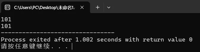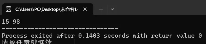 #include<bits/stdc++.h>using namespace std;intmain(){ int a = 15; // 定义变量a,里面放15 int b = 98; // 定义变量b,把98赋值给b cout << a << " " << b; return 0;}