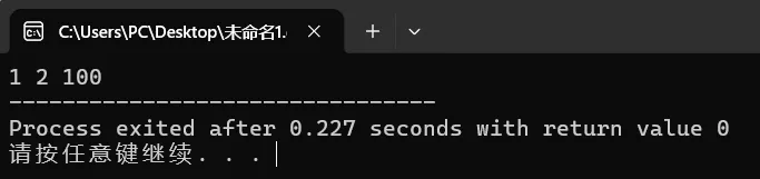 #include<bits/stdc++.h>using namespace std;intmain(){ int a = 1, b = 2, c = 100;//定义三个变量,分别进行赋值 cout << a << " " << b << " " << c; return 0;}