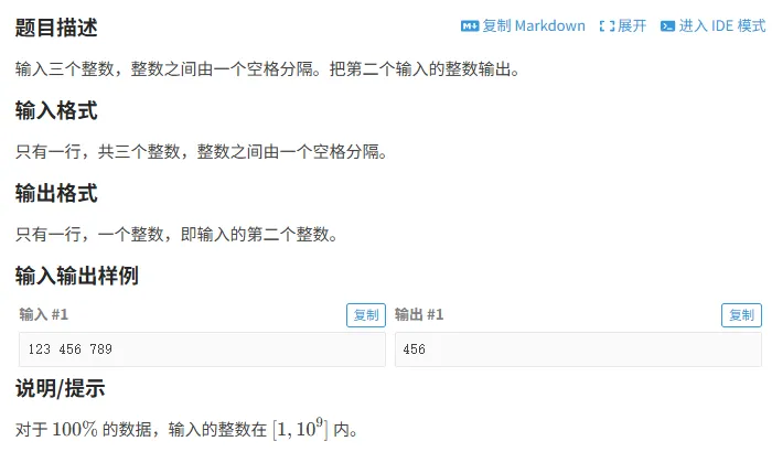 #include<bits/stdc++.h>using namespace std;intmain(){ int a, b, c;//定义三个整型变量 cin >> a >> b >> c;//分别输入三个数字 cout << b;//输出第二个数字 return 0;}
