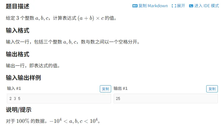 #include<bits/stdc++.h>using namespace std;intmain(){ int a, b, c;//定义三个变量 cin >> a >> b >> c;//分别输入三个数字 cout << (a + b) * c;//求出结果 return 0;}