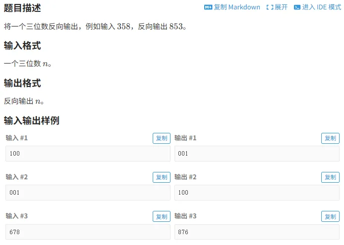 #include<bits/stdc++.h>using namespace std;intmain(){ int n; cin >> n; int a = n % 10;//个位 int b = n / 10 % 10;//十位 int c = n / 100;//百位 cout << a << b << c;//输出个位 十位 百位 return 0;}