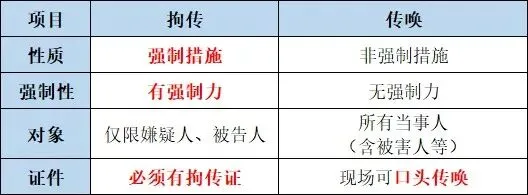 1. 拘传 vs 传唤(核心区别)
