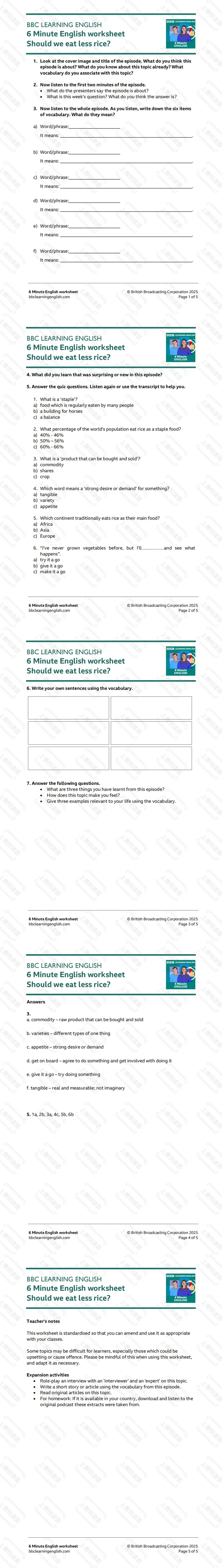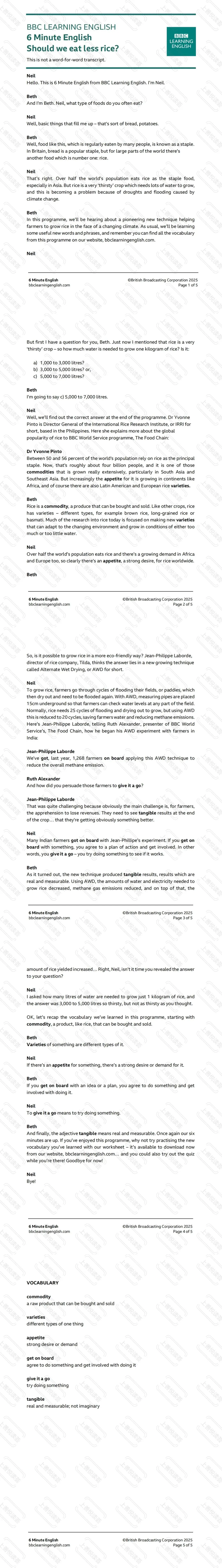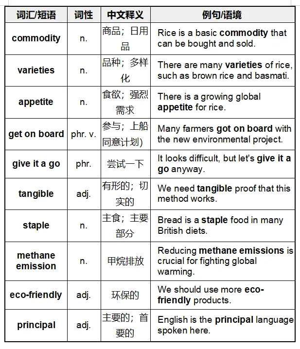 •文化背景:了解了“主食”(staple food)的概念,以及大米在全球饮食结构中的核心地位(特别是亚洲、非洲和拉丁美洲的差异)。