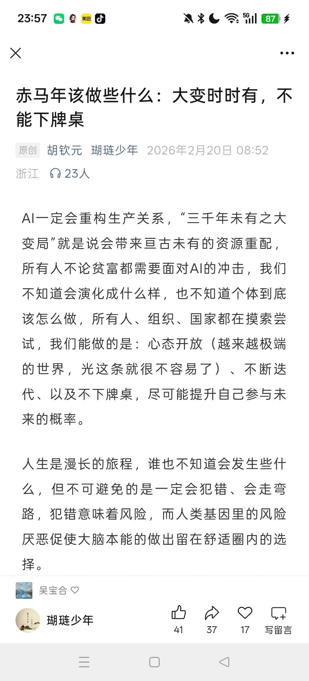 文章以“大变时时有,不能下牌桌”为核心,围绕AI时代的生存逻辑展开,核心结论是:在“三千年未有之大变局”中,活下去、不下牌桌,才是最大的胜利。