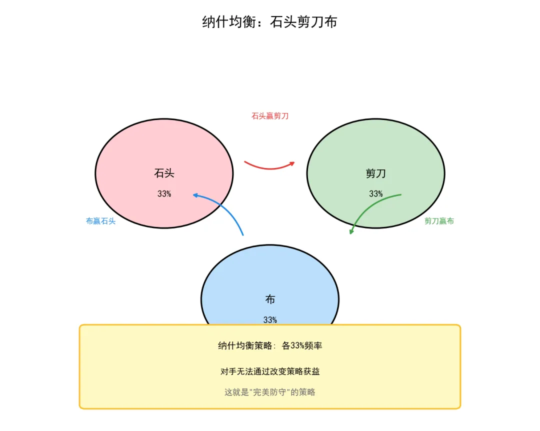 • 如果你33%石头、33%剪刀、33%布 → 对手无论出什么,长期都打平