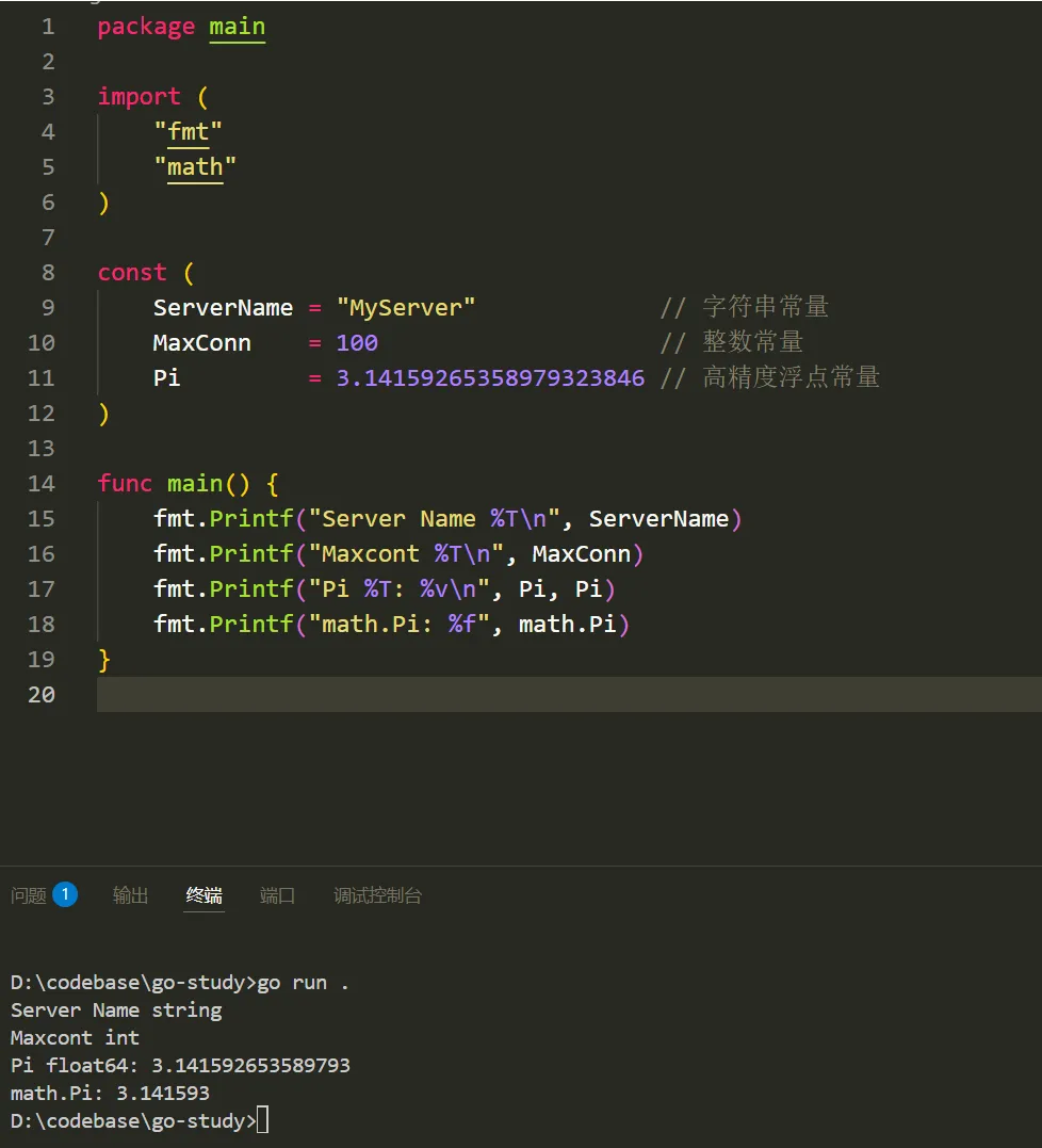 注意,常量也可以定义为有类型的,仅限刚才提到的基础类型,下面有一个例子