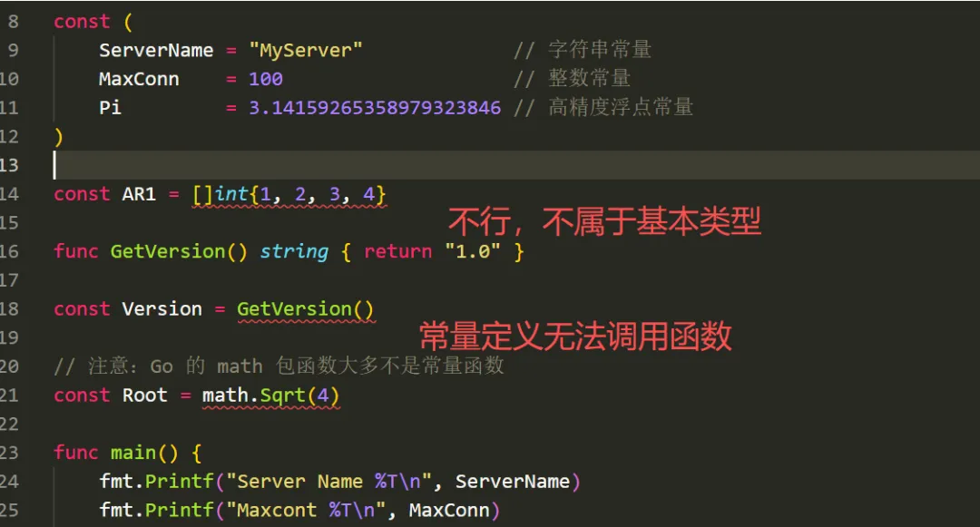 const 用来定义常量,仅限基本类型,别使用函数返回值 配合iota使用效果更佳