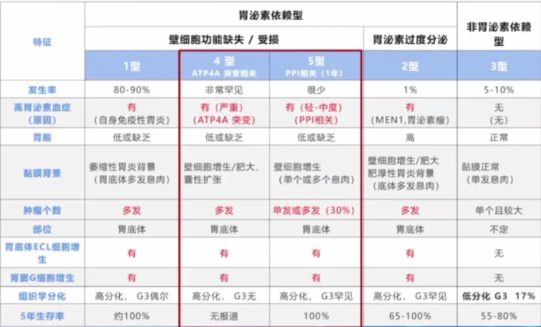 胃肠嗜铬样细胞(ECL细胞)NET在原有1型(慢性萎缩性胃炎)、2型(MEN1)、3型(散发)基础上,新增两类:4型、5型: