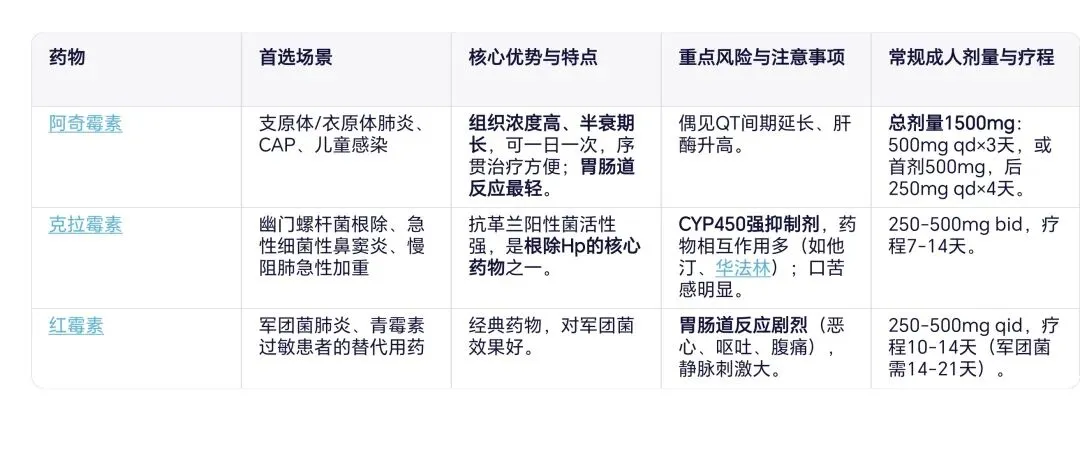 *孕妇:阿奇霉素相对最安全(B类),可酌情使用;克拉霉素和红霉素(C类)需权衡利弊。