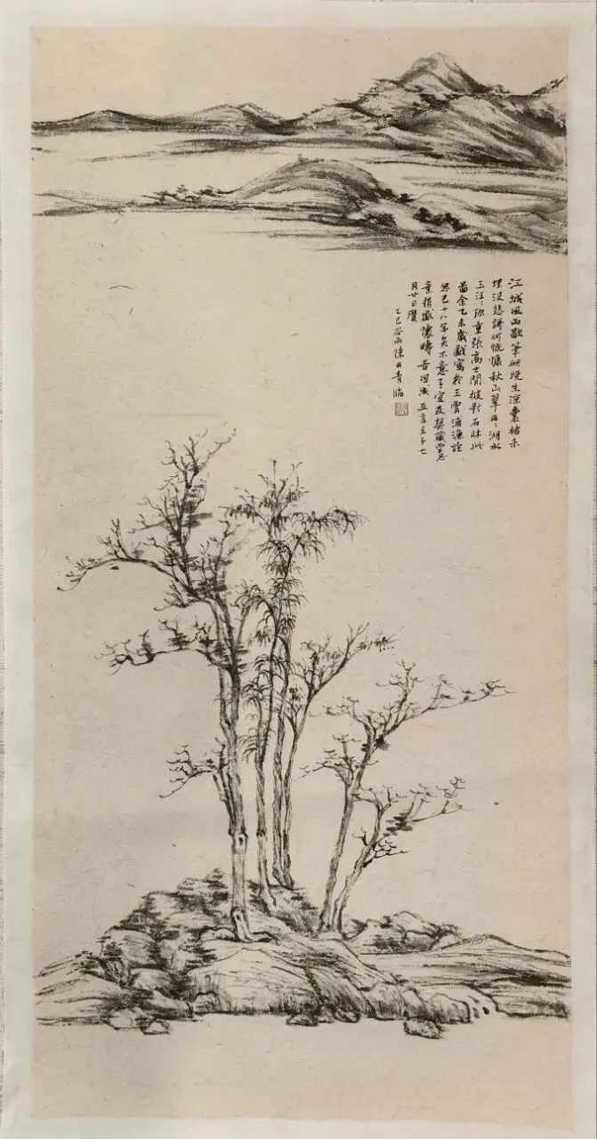《六君子图》纸本水墨,纵61.9厘米,横33.3厘米,现藏上海博物馆。画中坡石皴法已具折带雏形,但较晚年作品略显圆润,山石结构清晰,与六株挺拔的树木相映成趣。
