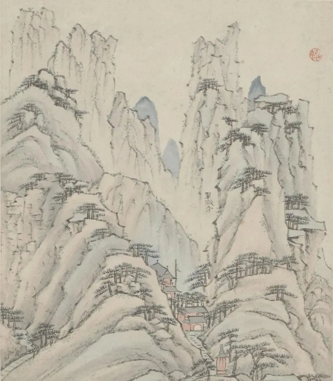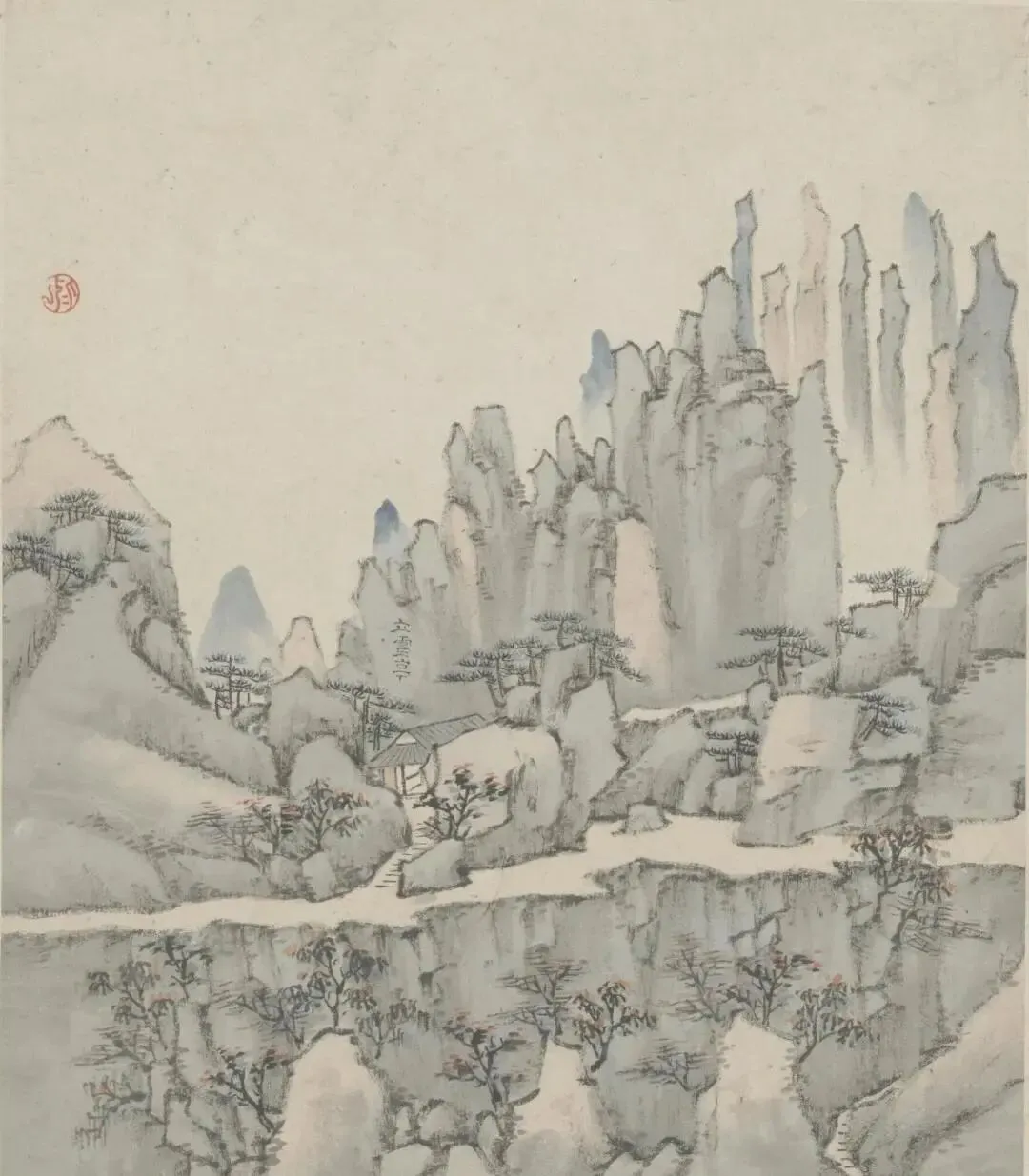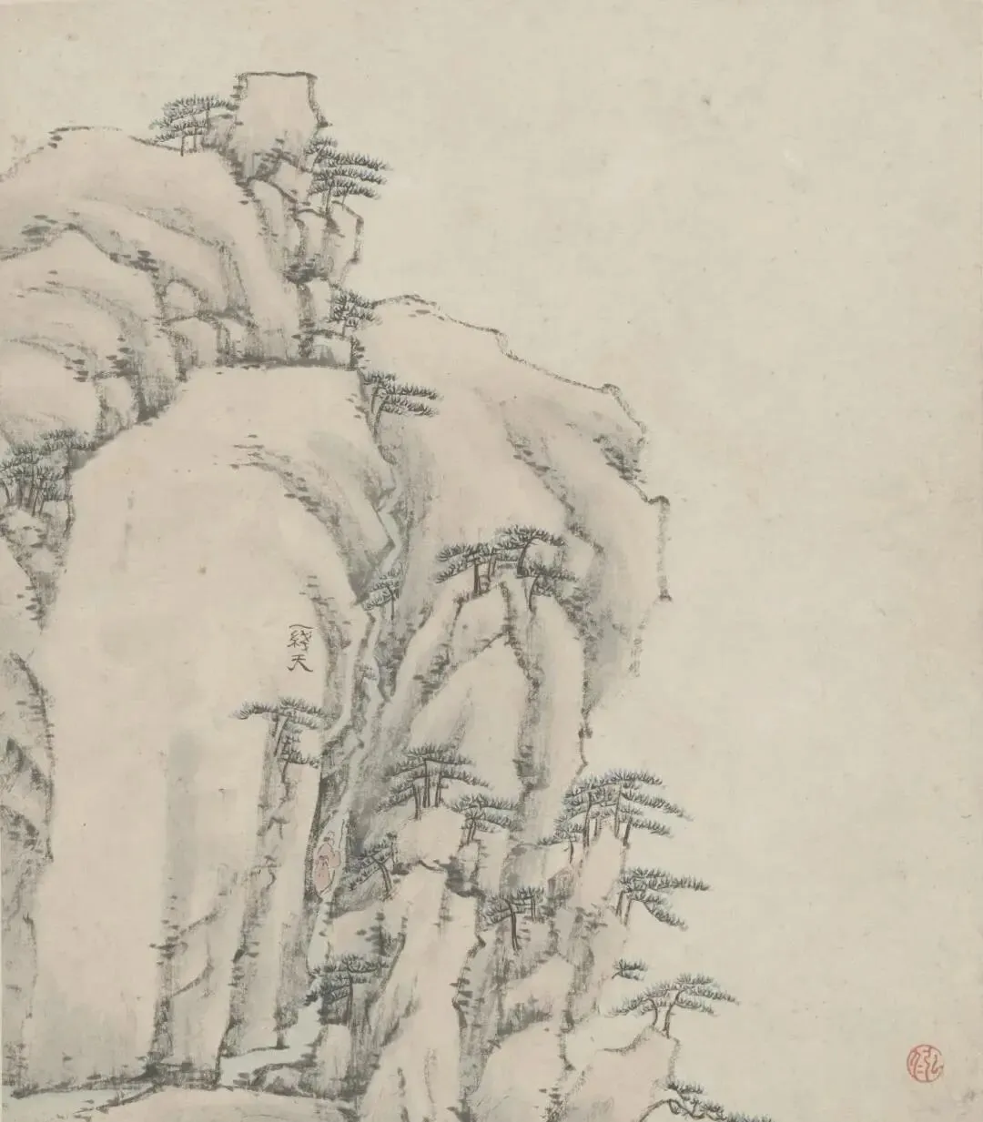 《黄山图册》共60开,纸本设色/水墨,每开纵21.4厘米,横18.4厘米,现藏北京故宫博物院。册页中大量运用变体折带皴,以极简的方折线条勾勒黄山怪石,被誉为“得黄山之质”。