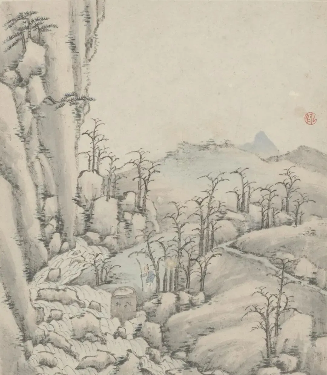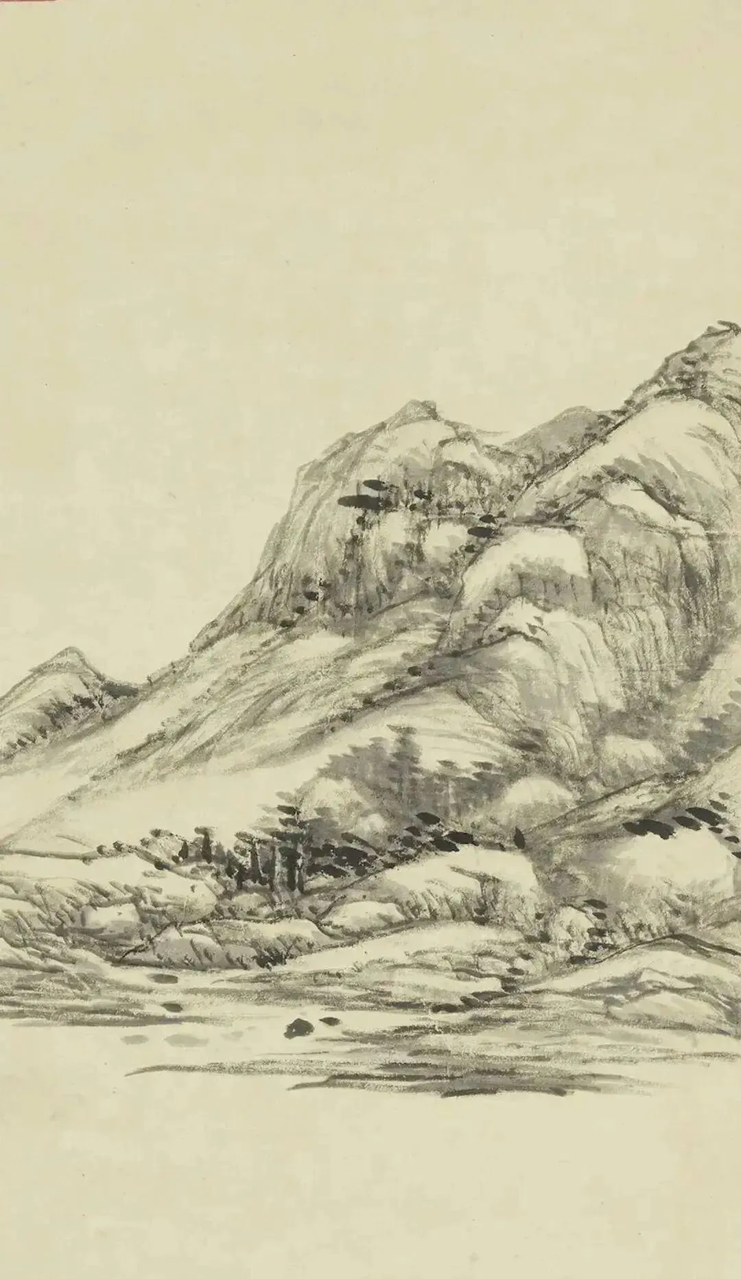 折带皴给人以清冷孤峭、萧疏简淡之感,擅长表现太湖流域水边平坡或沉积岩的层叠结构。这种皴法能够清晰地展现出山石的几何结构与体面转折,使山峦仿佛具有一种理性的秩序感,为画面增添了一份冷静与寂寥。它体现了元代文人画“逸笔草草”的审美追求,是表现荒寒意境的重要皴法。