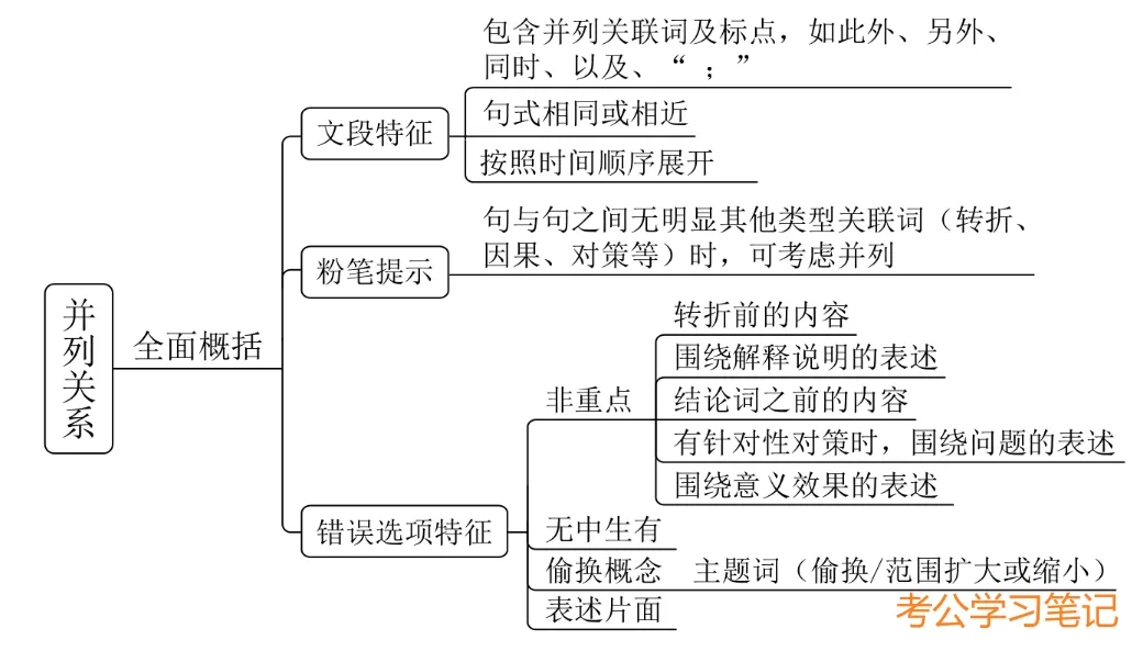 并列关系解题技巧:(1)话题范围判断:句与句之间无明显其他类型关联词(转折、因果、对策等)时,可以考虑并列关系;(2)优先看选项:①选项短小精悍;②选项格式一致,或句式相同。