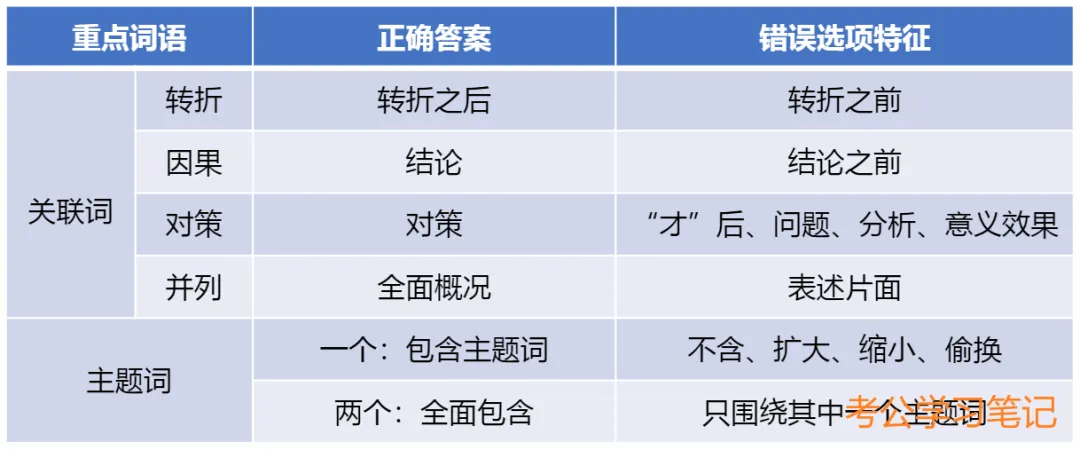 错误选项特征(非重点+无中生有):①转折前的内容;②围绕解释说明的表述;③结论词之前的内容;④无中生有;⑤与文意相悖⑥偷换概念、主题词(偷换/范围扩大或缩小)。