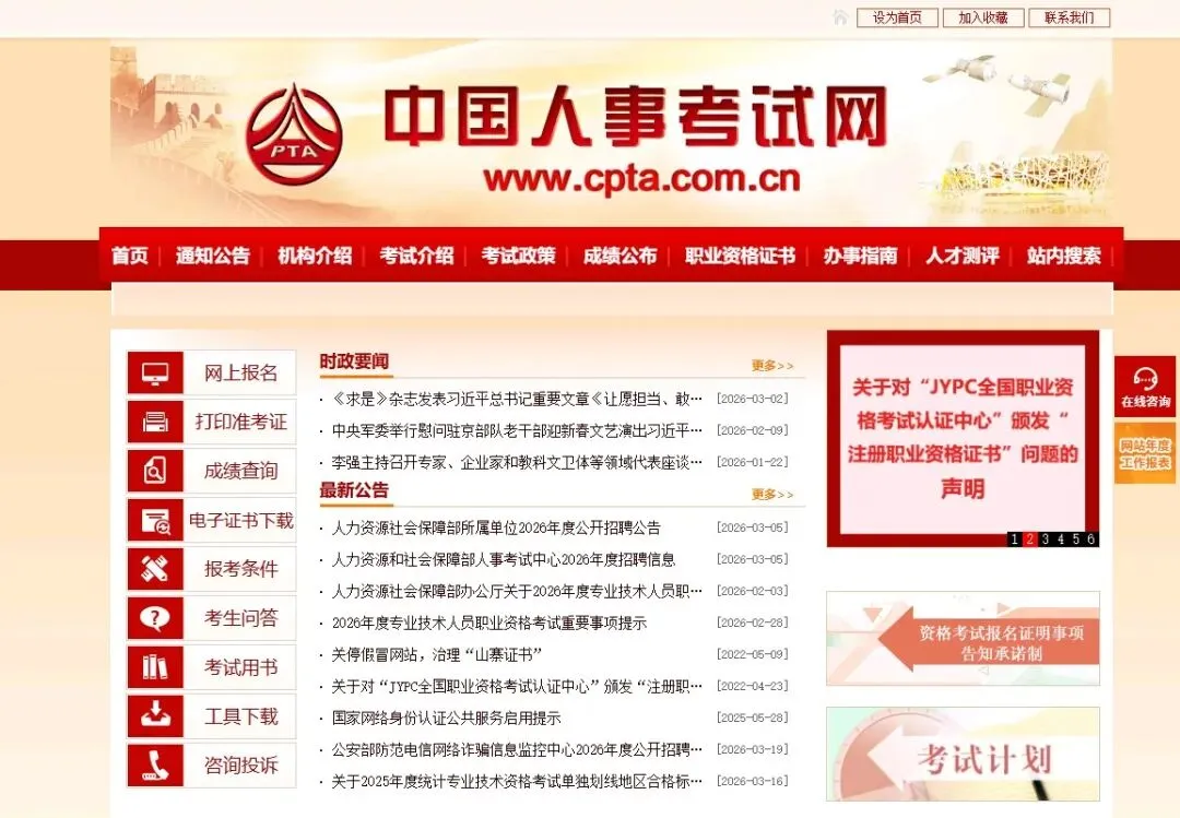 - 报名网址:全国统一入口中国人事考试网(www.cpta.com.cn)。