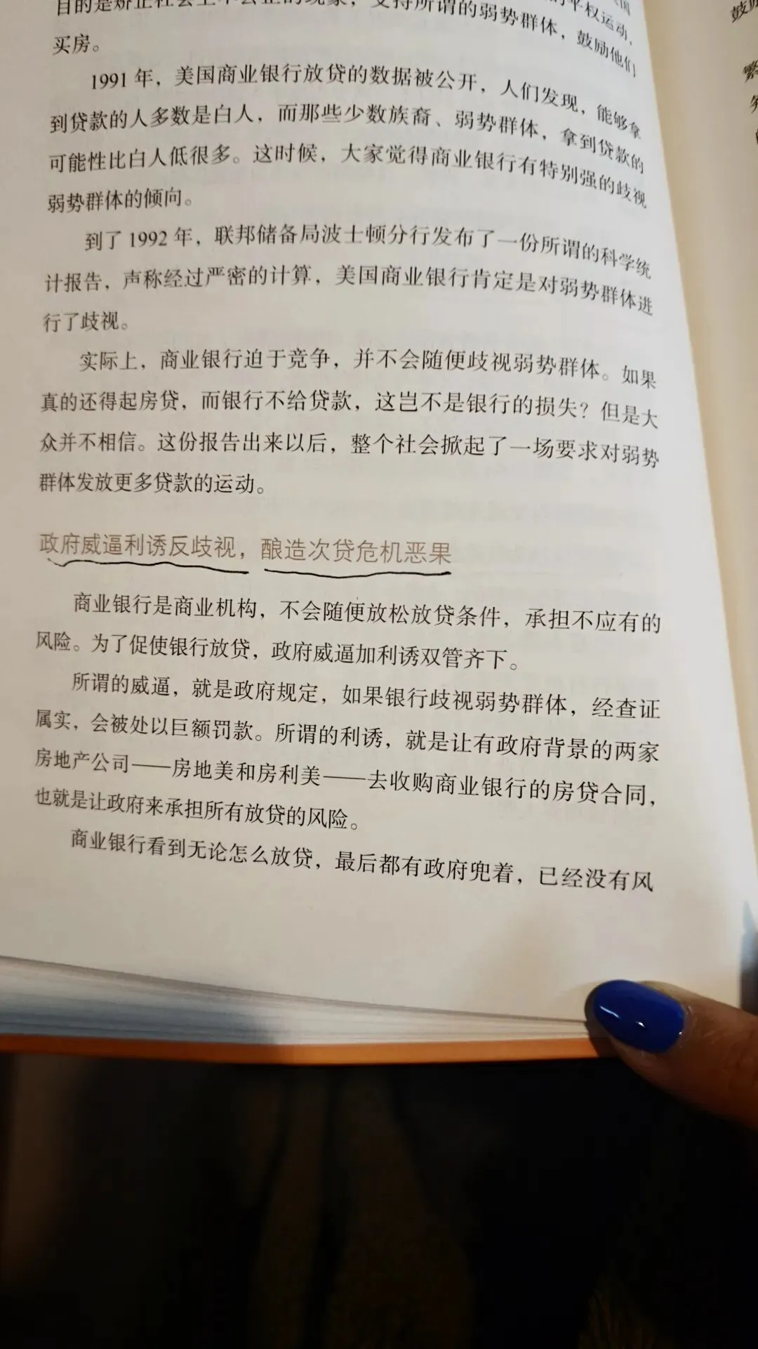 第一个问题,以前一直疑惑为啥美国银行可以这么“傻”?面对没有很强还款能力的人也敢放贷给他们买房?利息低、高风险,不是银行风控最要防范的吗?如果没有一开始的这些放贷,就不会有后面的银行打包贷款产品,造成次贷危机啊?---结果,薛兆丰书中提到美国政府为了避免歧视,国家担保银行放贷给低收入人群去买房,凡是发现“歧视”低收入人群的放贷银行还会被罚款。而从相关资料来看,美国确实建立了成熟的抵押贷款保险和担保制度,联邦住房管理局会为低收入人群的住房贷款提供保险,承担还款风险,甚至在次贷危机发酵期间,美国还通过相关法案扩宽担保标准,为中低收入购房者提供担保。正是因为有美国政府的兜底,银行的贷款风险被大幅转移,所以美国银行放开了“风控”。(事情又很多面,一定要多看看啊,不要轻易下判断)