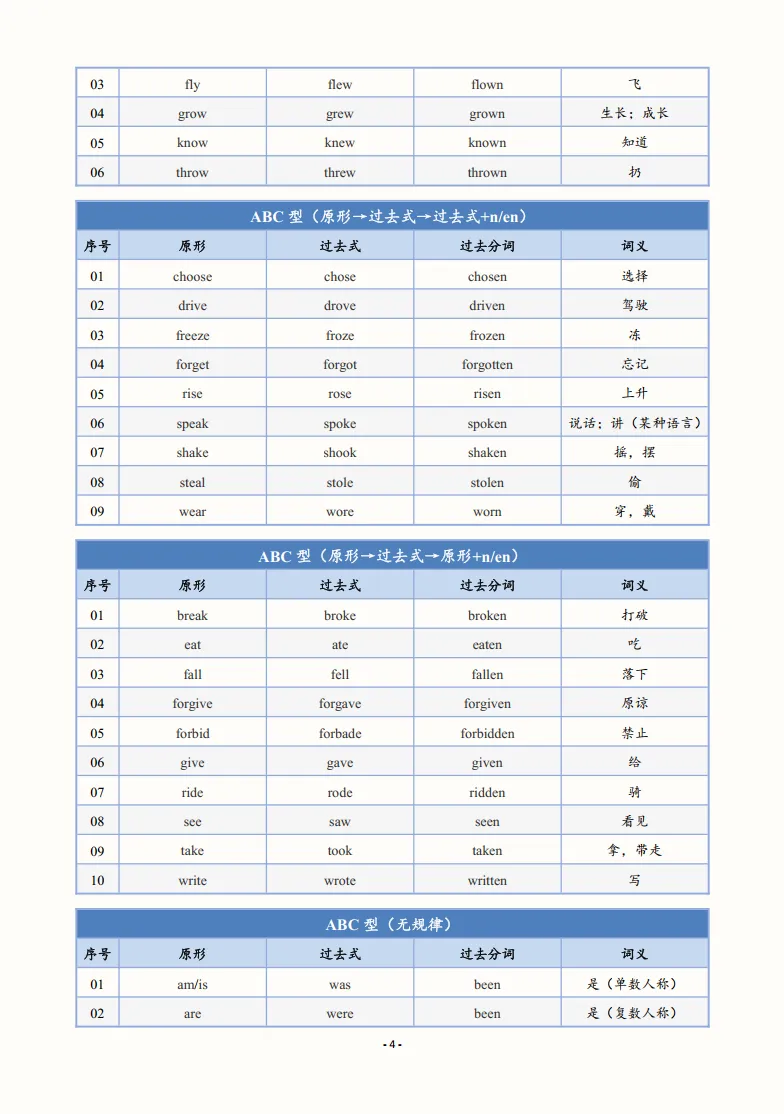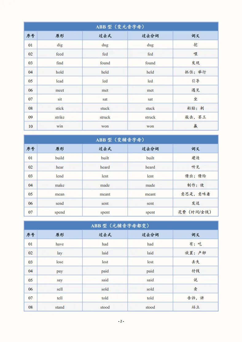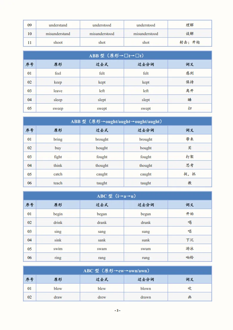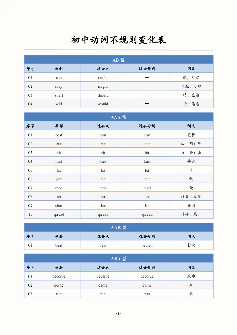 >【英语学习资料】初中英语动词不规则变化表