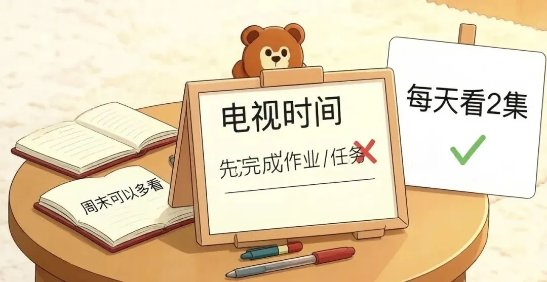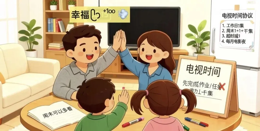 本周家庭会议的议题是“电视/动画片时间管理”。过去一周,因为看电视时间的问题,家里已经发生了3次争吵。爸爸、妈妈、5岁的儿子和3岁的女儿围坐在客厅地毯上,中间放着发言棒(小熊玩偶)和议程本。
