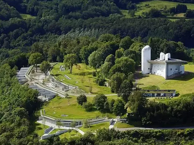 【05】朗香教堂远景,从山下看,建筑像从山顶生长出来,与地形融为一体。