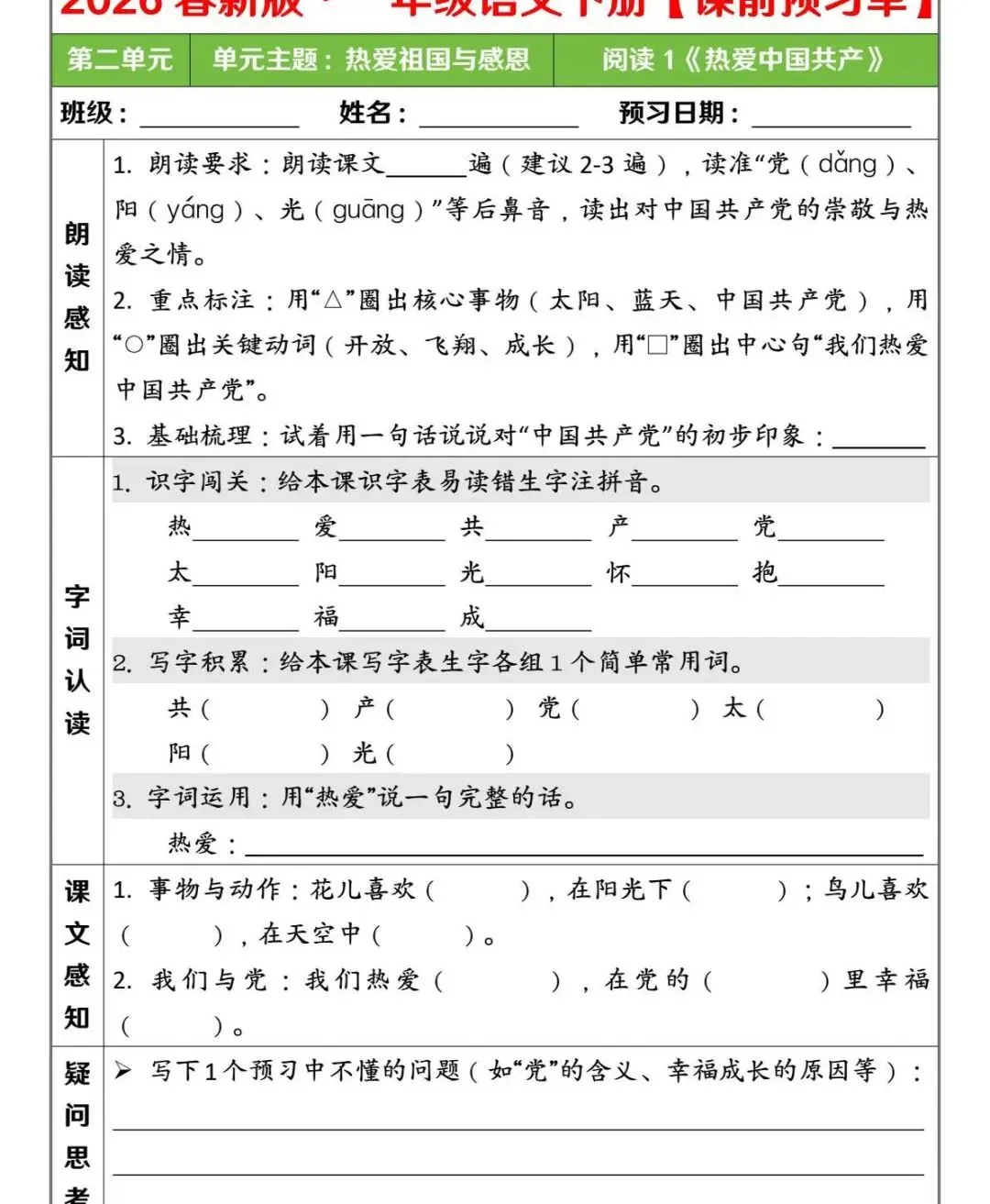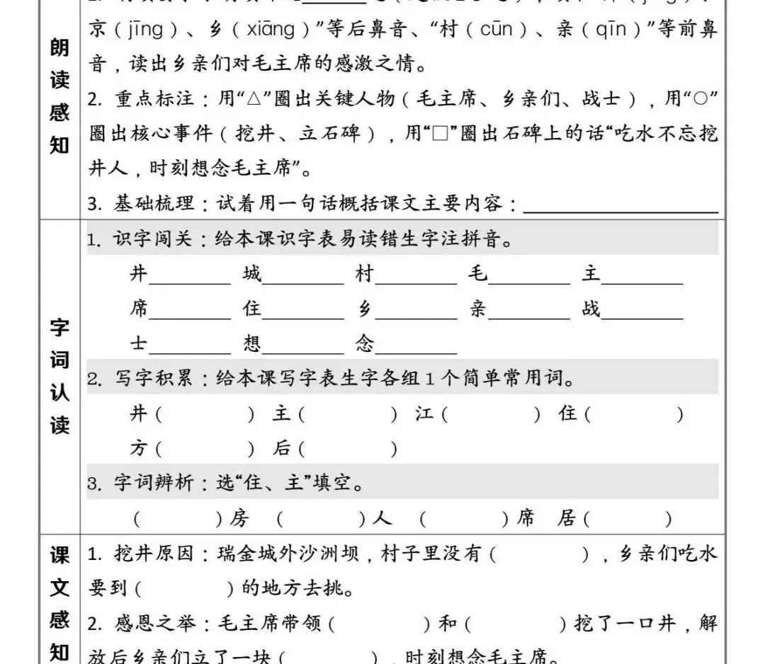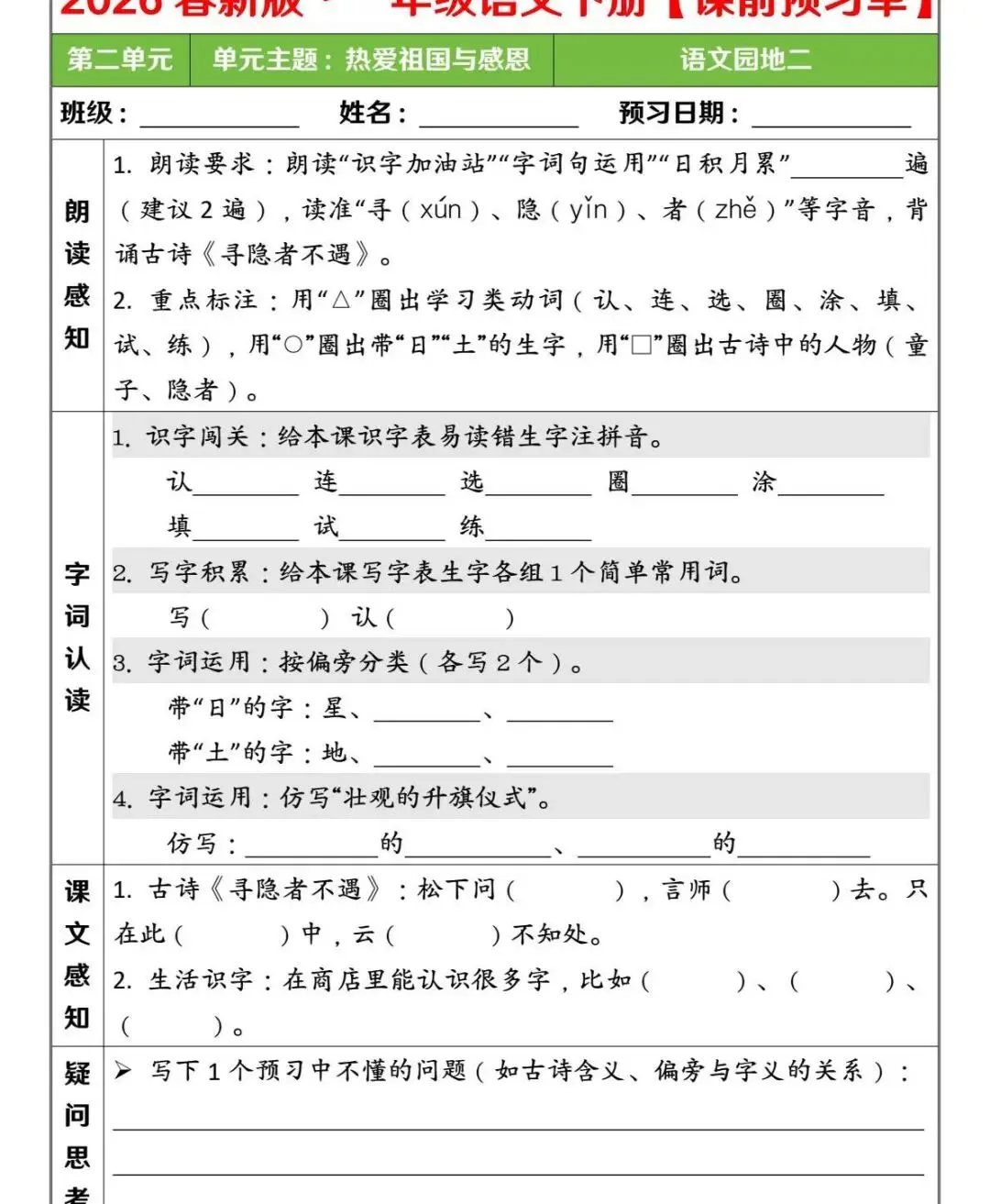 一年级(下)语文 第二单元课前预习单