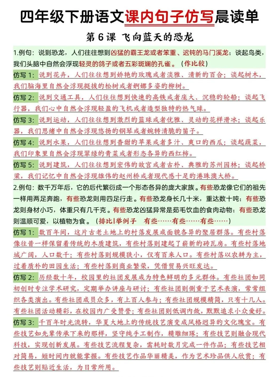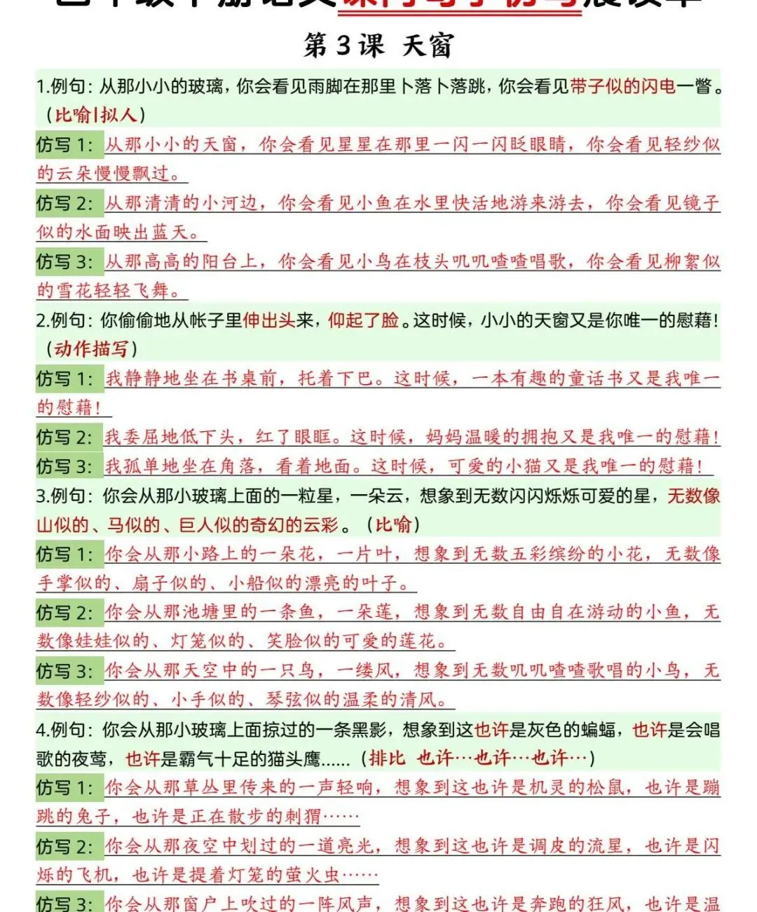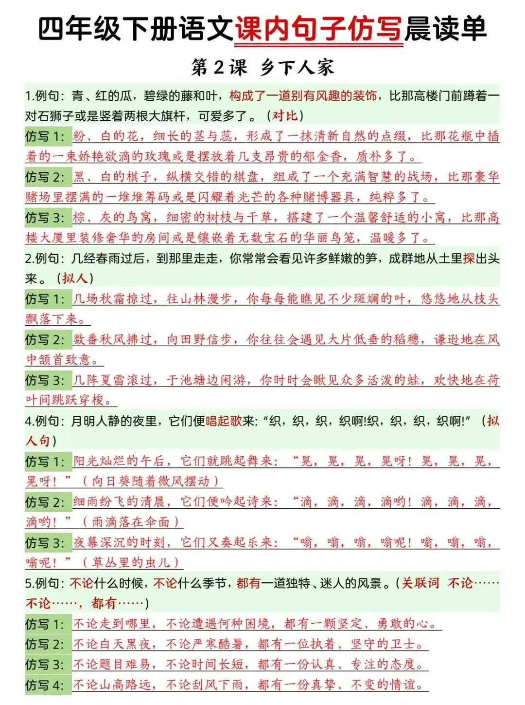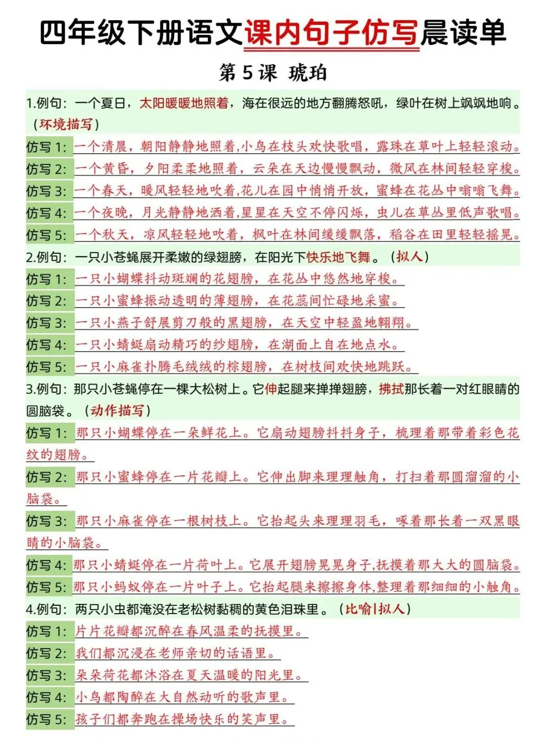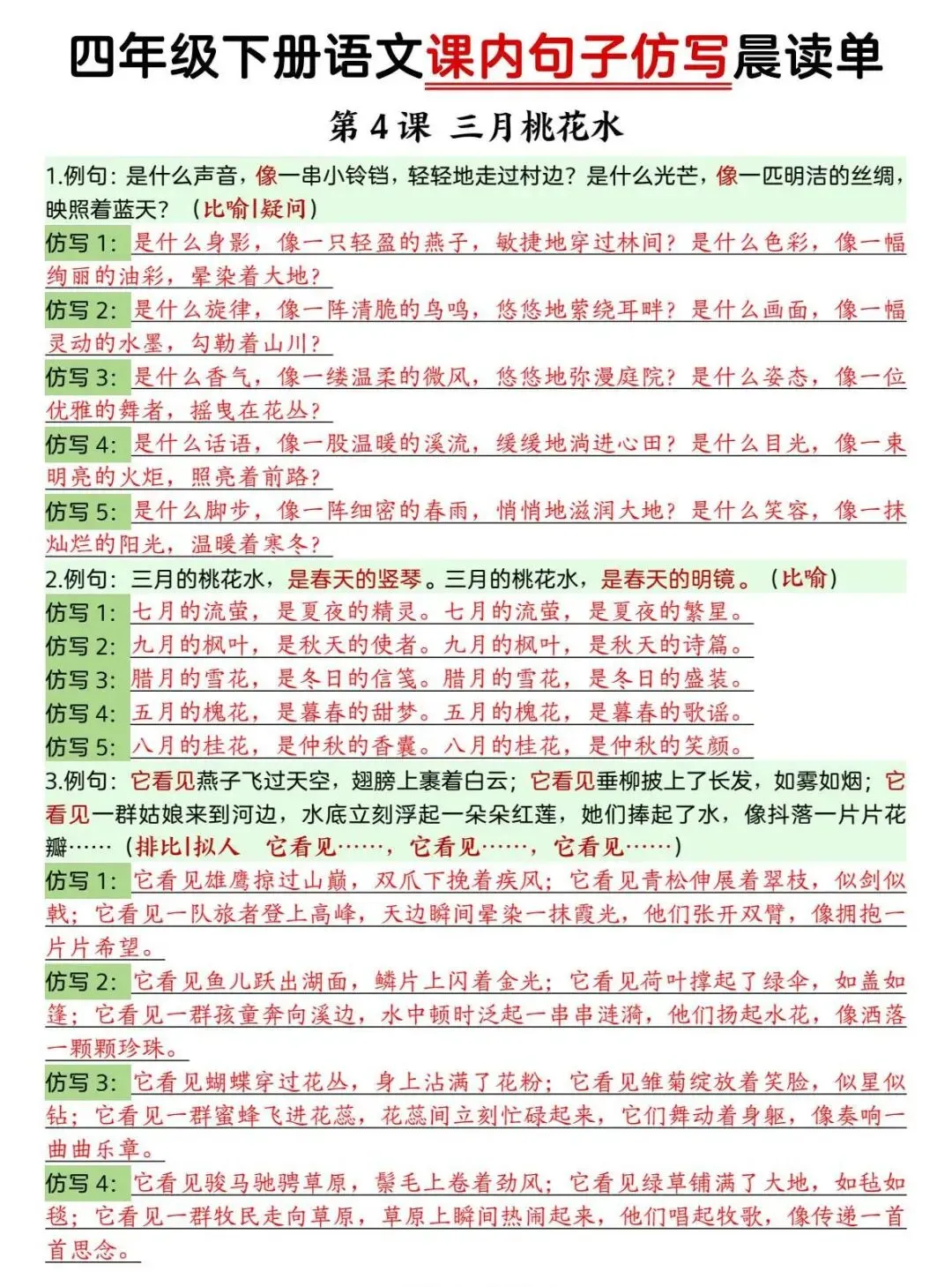 四年级下册语文 课内句子仿写晨读单