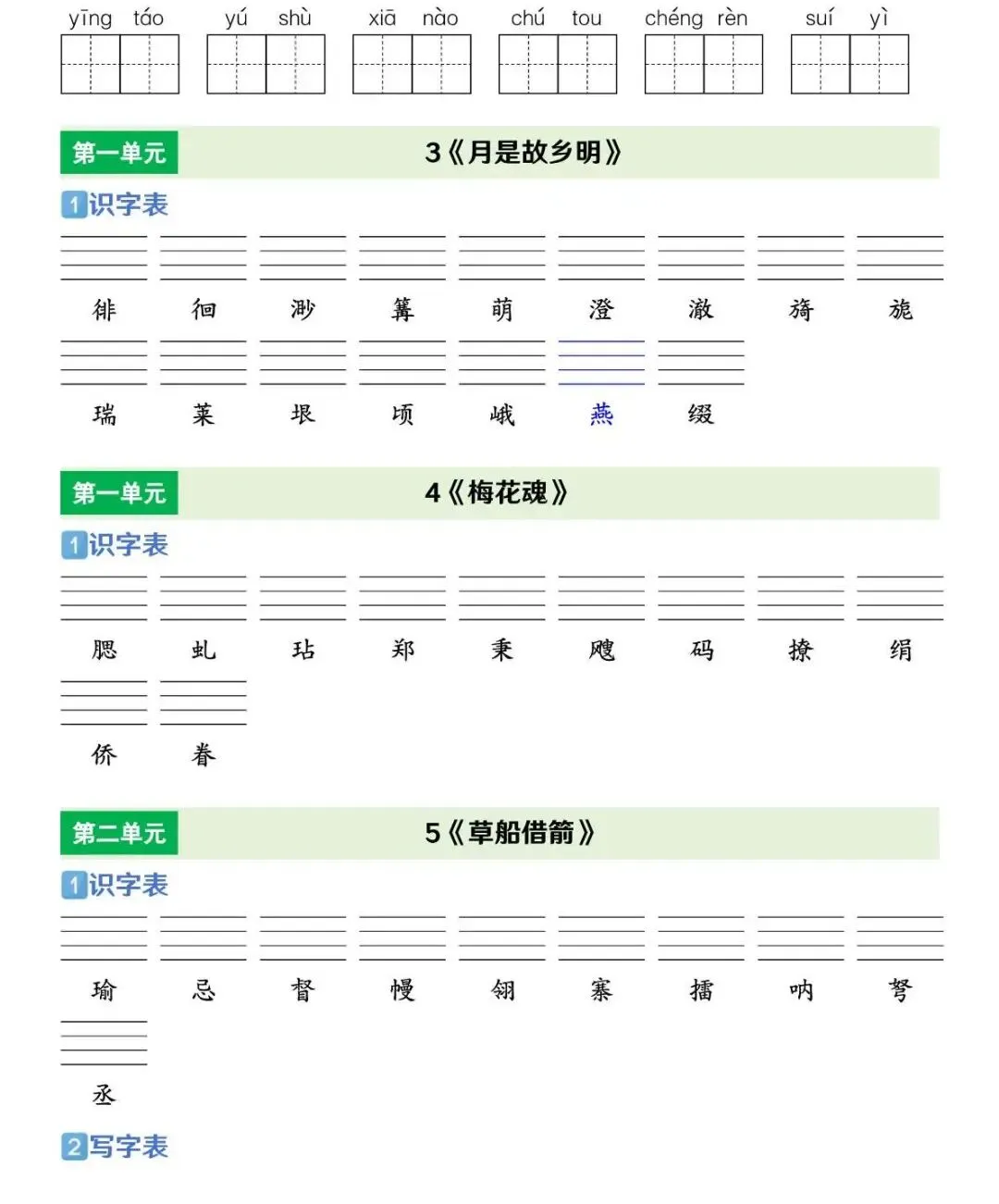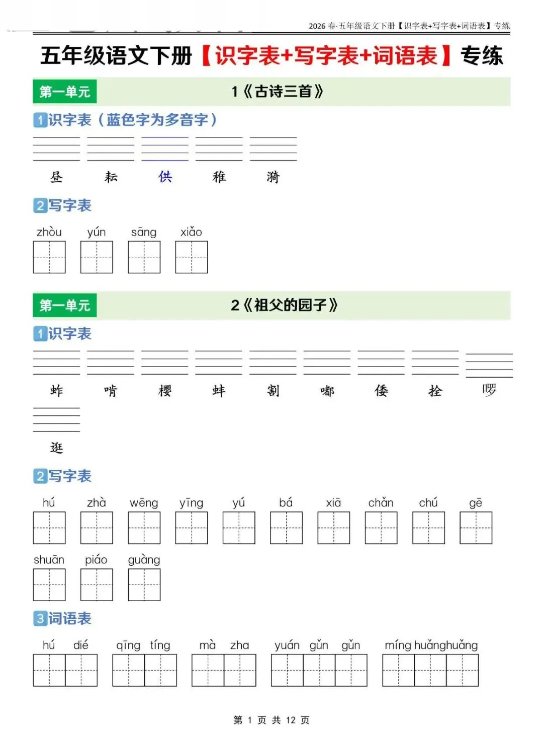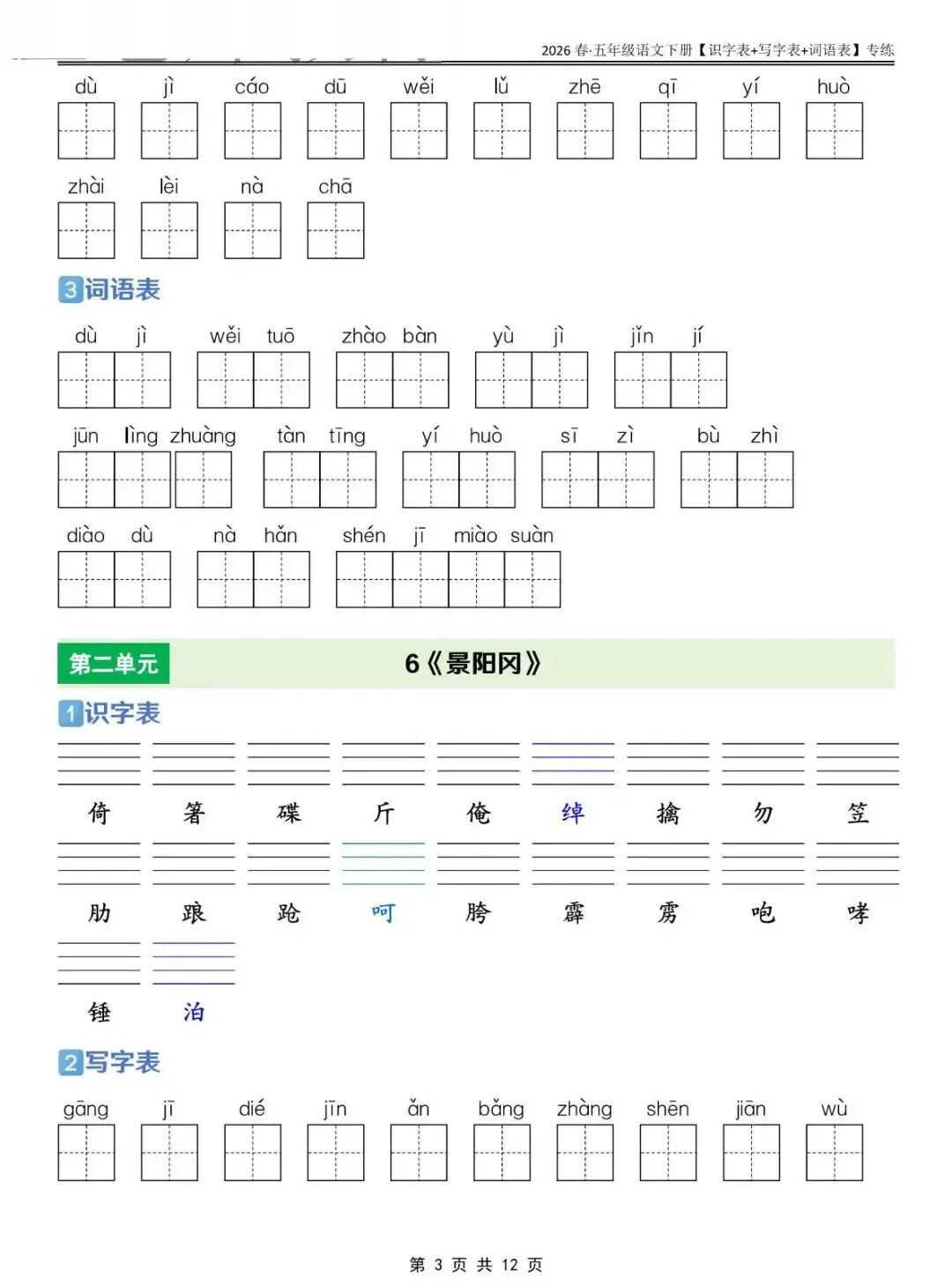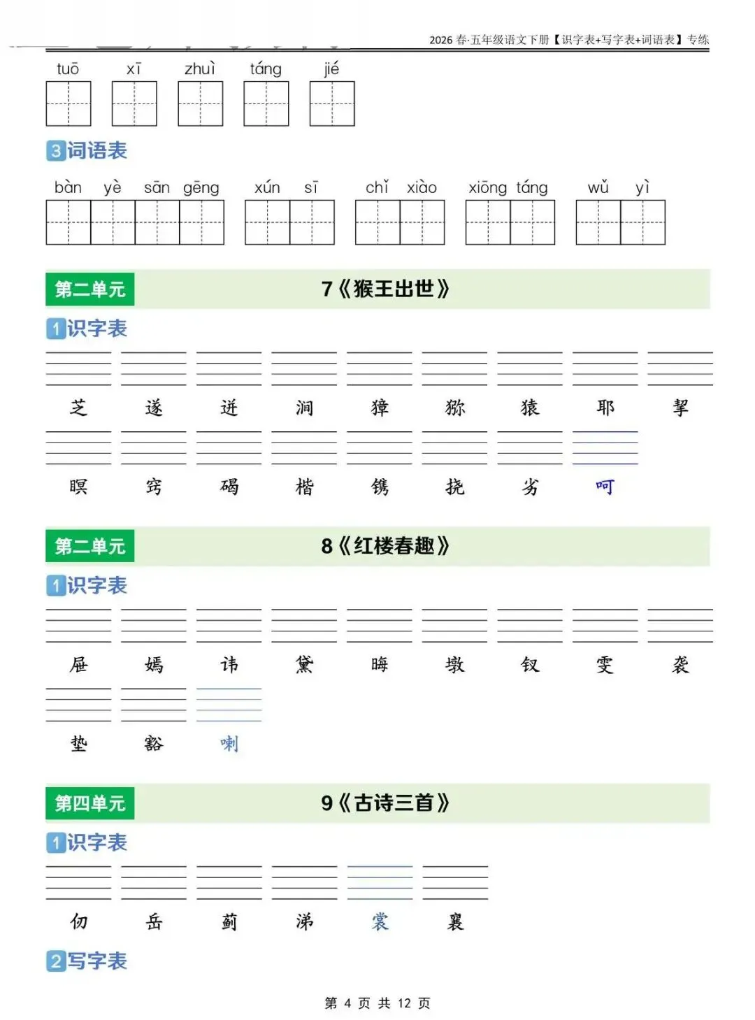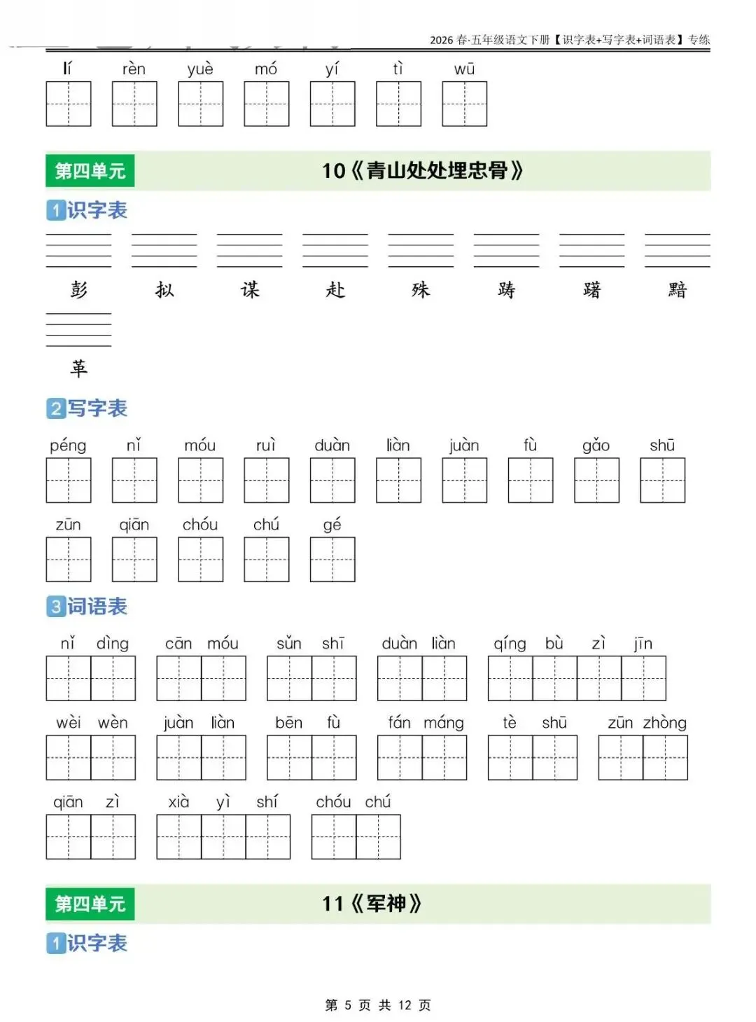 五年级下语文 识字表+写字表+词语表专练