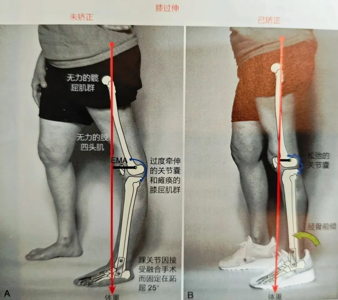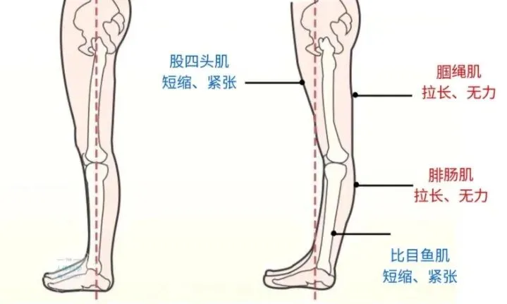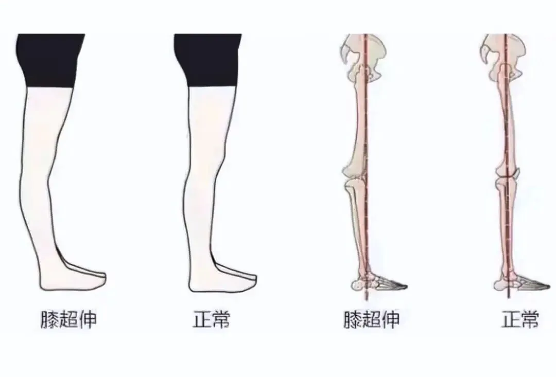 重点理解:即使膝关节角度没有明显超过0度,但只要身体重心线落在膝关节后方,导致膝盖后方承受持续、过大的压力,这就是功能性的“膝过伸”。真正的危害也正在于此——它会导致膝关节后方的关节囊、韧带被过度牵拉而松弛,并可能损伤半月板,长期会引起疼痛和关节不稳定。