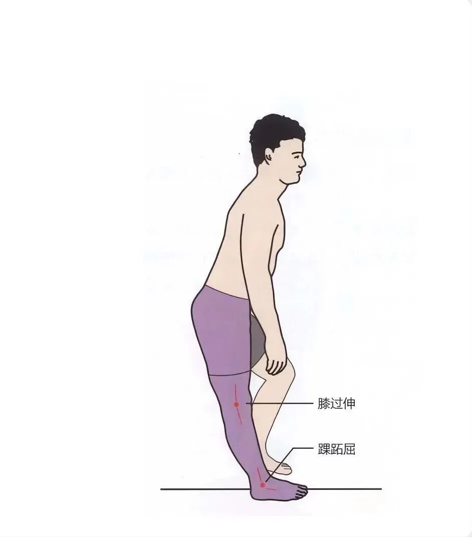 偏瘫患者常见的两种膝过伸模式:一是整体重心后移,膝盖被“锁死”在后伸位;二是走路时膝盖控制不住地快速向后“弹”一下,后者对关节的冲击可能更大。