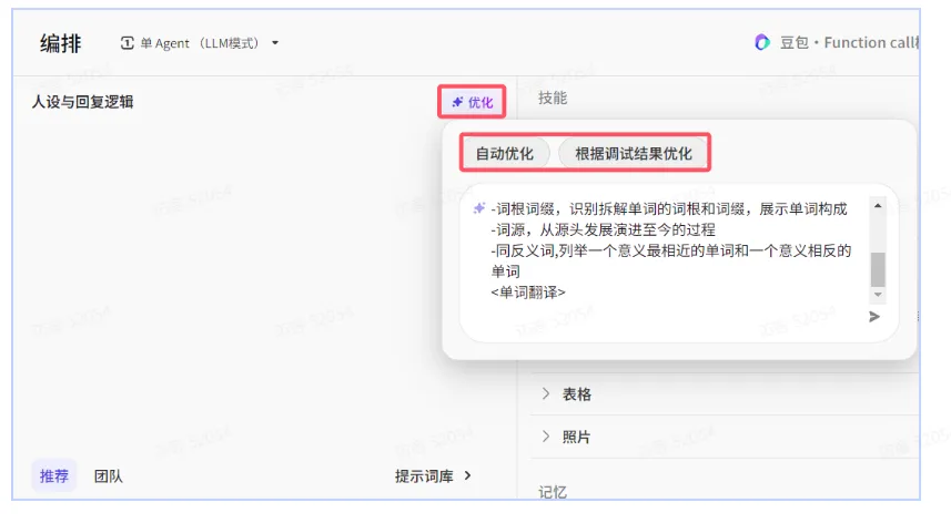 使用提示词后,系统会将选择的提示词自动填充到提示词的编辑框中,你可以基于自己的业务场景修改提示词。修改提示词时,你需要重点关注提示词中的高亮部分