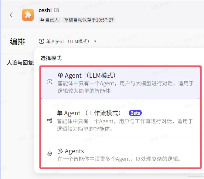 coze平台提供了单Agent(LLM)、单Agent(工作流)、多Agent 三种模式。