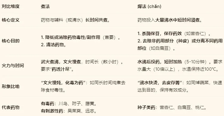 煮法与燀法同属“水火共制”,但目的、时长与强度截然不同,是炮制中处理有毒药材或种子类药材的关键技术。