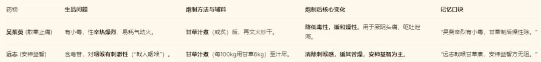 (1)横向对比:将煮法的“减毒”与炙法中醋制甘遂的“减毒”对比(一为水煮水解,一为辅料中和)。