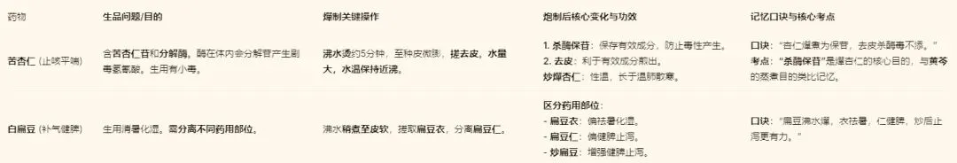 (2)一看到苦杏仁、白扁豆,立刻想到——燀制是为了保存有效成分或分离部位。
