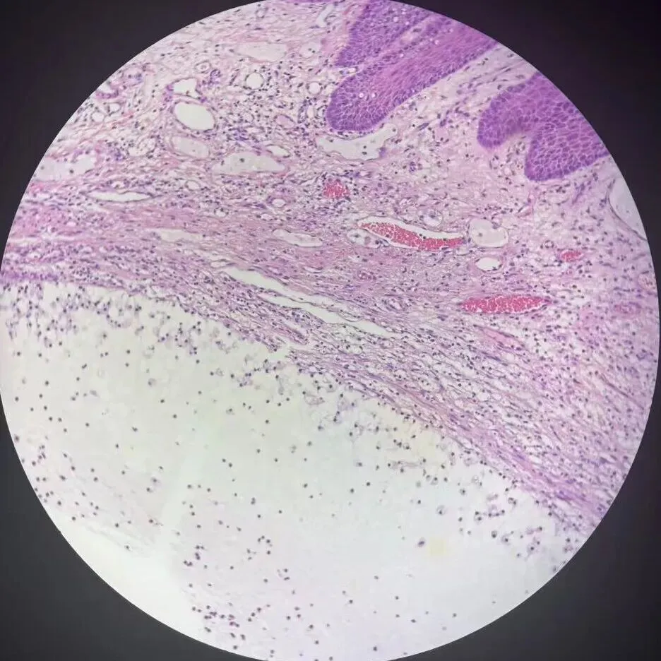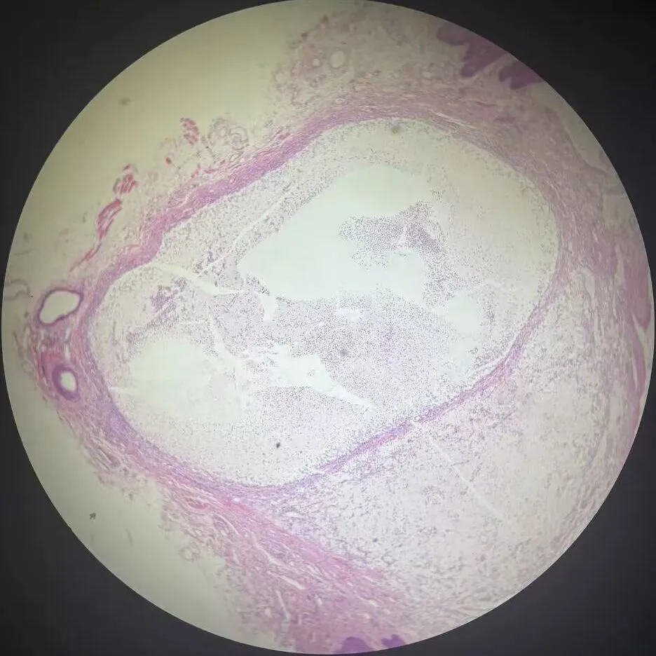 •病理:囊壁为肉芽/ 纤维组织,囊腔含嗜酸性黏液,可见泡沫样巨噬细胞;无完整上皮衬里。