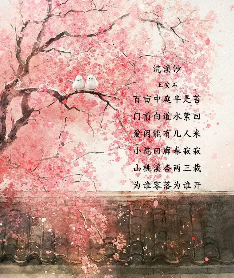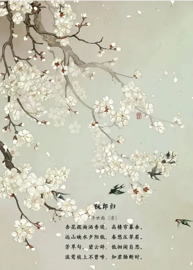 看到杏花的诗词,总会想起《甄嬛传》里那句:“那年杏花微雨,你说你是果郡王,也许从一开始就是错的……”杏花沾了微雨,香风漫过堤岸,朱红宫墙里,帘幕低垂,遮住了半盏夕阳。远山浸在暮色里,春愁压得眉弯轻颤,连流莺都敛了声息,怕惊碎这满纸相思——她在故院徘徊,等一场归期,也等他的消息。