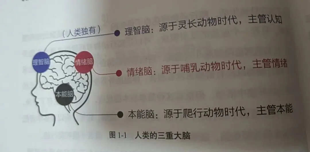 《认识觉醒》这本书本来是4月份我们读书会要读的书,我提前买了,也提前看了一点,就被他吸引住了,所以就开始提前读了起来。既然读了,那就在公众号上记录一下。今天阅读的是第1章(大脑—一切问题的起源)第1节,大脑:重新认识你自己。读完这一节,我们认识了本能脑,情绪脑以及理智脑。以及他们的高低之分与权力之争。人类的天性就是目光满短浅,及时满足。原因书中有说明。然后到了现代就是变成了避难趋易和急于求成。成长是克服天性的过程。明白它们三位一体,缺一不可。最后用我们的理智脑,驱动本能和情绪。如何运用三者,需要大量练习,才能让它们各司其职。看了下面图片,想一想我们日常生活中有什么事情会让这三重大脑相互打架。