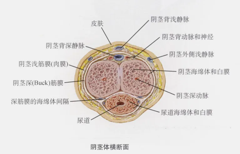 向深部分离,暴露出包裹阴茎海绵体和尿道海绵体的深筋膜(Buck筋膜)。