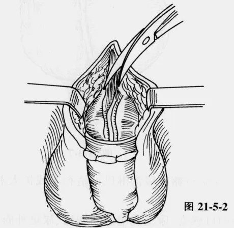 阴茎根部椭圆形切口,逐层切开皮肤、皮下脂肪及阴茎浅筋膜(肉膜)。