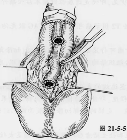 游离、双重结扎并切断阴茎背深静脉、阴茎背动脉、阴茎背神经,妥善止血。尽量向近端游离并保护阴茎背神经,以保留部分感觉功能。