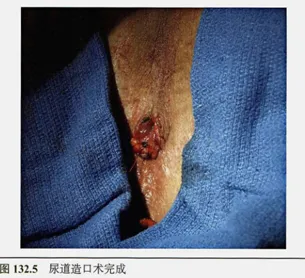尿道造口:锐性切断多余的尿道,尿道必须无张力地置于会阴部。在无张力情况下,尿道应露出皮肤切口1cm。用细丝线将尿道海绵体外层与皮下组织间断缝合数针,略加固定。