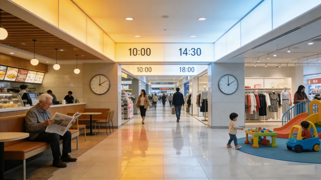 扶手温度:秋冬季节,金属扶手需保持温热(或包裹亲肤材质)。地面摩擦系数:保洁拖地后,必须在5分钟内擦干,确保“光脚踩也不滑”。休憩设施:休息区座椅必须带软垫,且每两个座位配一个USB充电口。在主要动线增设“家庭休息站”(带沙发、饮水机、婴儿护理台)。4. 听觉(Auditory):分时段“背景音”
