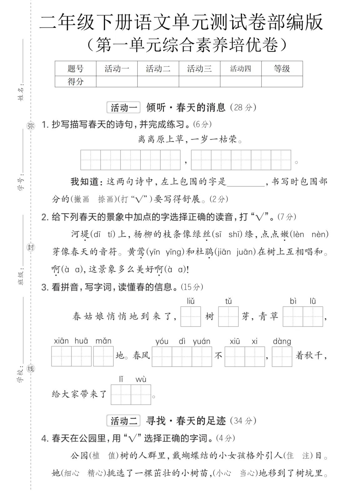 >学习资料|二下第1单元综合素养培优卷(含答案)